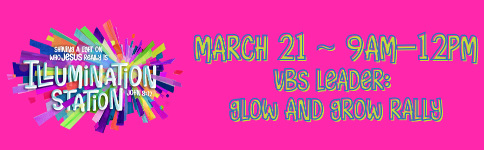 VBS Team Training will be March 21, 9AM-Noon. This training is required for all adult volunteers. (SWAT Training is provided at a later date.) Lunch is provided.